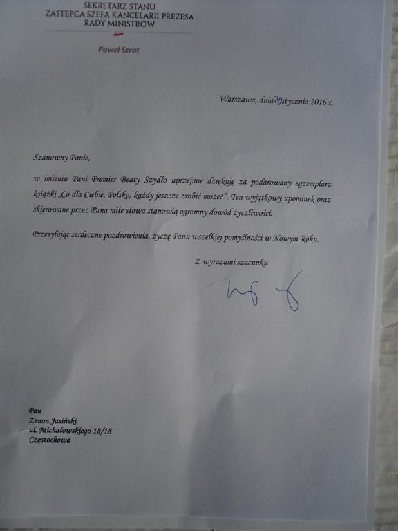 Pana Prezydenta, Panią Premier, Klub Poselski PiS, Klub Poselski Kukiz'15 oraz Klub Poselski Nowoczesna, który określił się jako Klub opozycyjny w stosunku do obecnego Rządu, (nie wysłałem do byłej Koalicji rządzącej PO i PSL, szczegóły na stronie). Wszystkim w/w wysłałem krótki list oraz moją książkę wydaną w 2014 r. „Co dla Ciebie Polsko, każdy jeszcze zrobić może?”. Liczę, że mój list, książka i materiały zamieszczone na stronie zostaną przeczytane ze zrozumieniem i pomogą w pracach dla dobra naszej Ojczyzny.